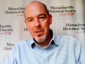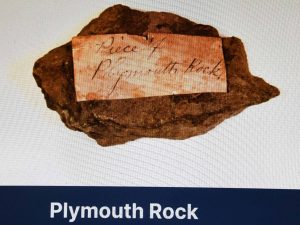 (Above, left) Director of Programs, Exhibitions and Community Partnerships for the Massachusetts Historical Society, Gavin Kleespies, moderated the hour-long zoom virtual tour of the Old Colony History Museum in Taunton, MA on August 13, 2020. Click here for the one-hour YouTube video of the virtual tour. (Above, right) The Museum collection contains one of the many pieces of Plymouth Rock that were distributed after half of the original rock was accidentally blown apart.