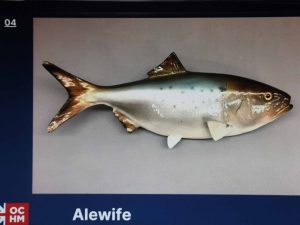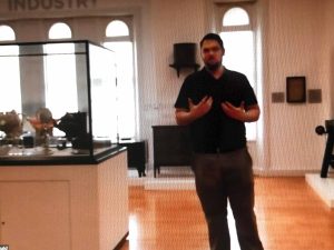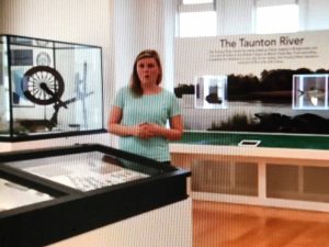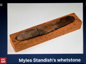 (Above) Museum Director Katie MacDonald begins the tour by pointing out a whetstone in their collection thought to belong to Plymouth Pilgrim Myles Standish.