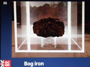 (Above) Collection Curator Bronson Michaud points out other 17th century pieces, including a piece of bog iron that was produced in an early forge located in Taunton in the mid 1600s.