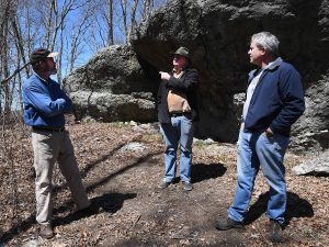 Birch Swamp Road resident and Providence College faculty member Dr. Keith Morton (left) and Barrington physicain Charles McCoy, MD, (right) invited Sowams Heritage Area Team Members Greg Spiess (center), Helen Hersh Tjader and Dave Weed to walk to Margaret’s Cave and hike through the nearby property owned by Dr. McCoy that was the likely site of the Massasoit’s winter campground in the early 1600s. History records that Roger Williams spent the winter of 1636 at Margaret’s Cave recovering from illness that he acquired when he walked to what is now Warren, RI and Swansea, MA following his banishment from Salem, MA. On the nearby property of Chace Farm can be found Wigwam Hill and an aboriginal birthing area near a large boulder as well as several ancient white oak trees some of which could have been there in the 1600s.