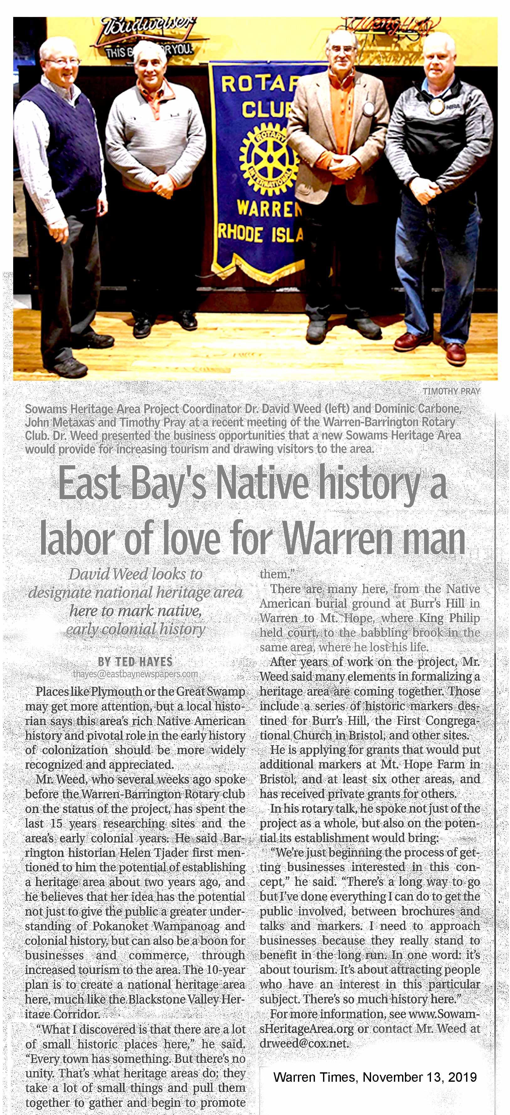 “Places like Plymouth or the Great Swamp may get more attention, but a local historian says this area’s rich Native American history and pivotal role in the early history of colonization should be more widely recognized and appreciated. Mr. Weed, who several weeks ago spoke before the Warren-Barrington Rotary club on the status of the project, has spent the last 15 years researching sites and the area’s early colonial years. He said Barrington historian Helen Tjader first mention to him the potential of establishing a heritage are about two years ago, and he believes that her ideas has the potential not just to give the public a greater understanding of Pokanoket Wampanoag and colonial history, but can also be a boon for businesses and commerce through increased tourism to the area. The 10-year plan is to create a national heritage area here, much like the Blackstone Heritage Corridor.
