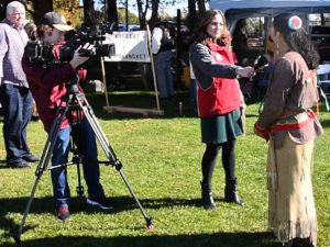 Channel 12 host Kate Walsh interviews Pokanoket Chief Po Pummukoank Anogqs (Dancing Star) while three women from the Tribe get something to eat.