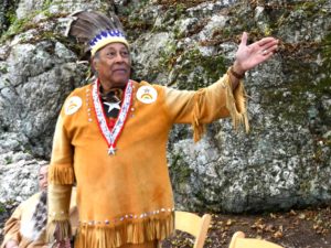 Pokanoket Sagamore Po Wauipi Neimpaug (William Guy), the tenth generation descendant of the Massasoit Osamequin, spoke about the history of his people at the Seat of Metacomet after Harry Hawk and Lee Braveheart Edmonds deliver a tobacco prayer in their native language. Click here for a 24-minute video.