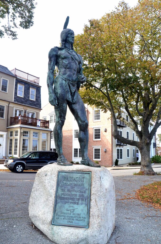 (Above) The Dallin statue in Plymouth portrays the Massasoit Ousamequin, and a drawing of his son, Philip (Metacomet) illustrates how he might have looked. In 1638, Roger Williams questioned the sales of Prudence and Aquidneck Island.