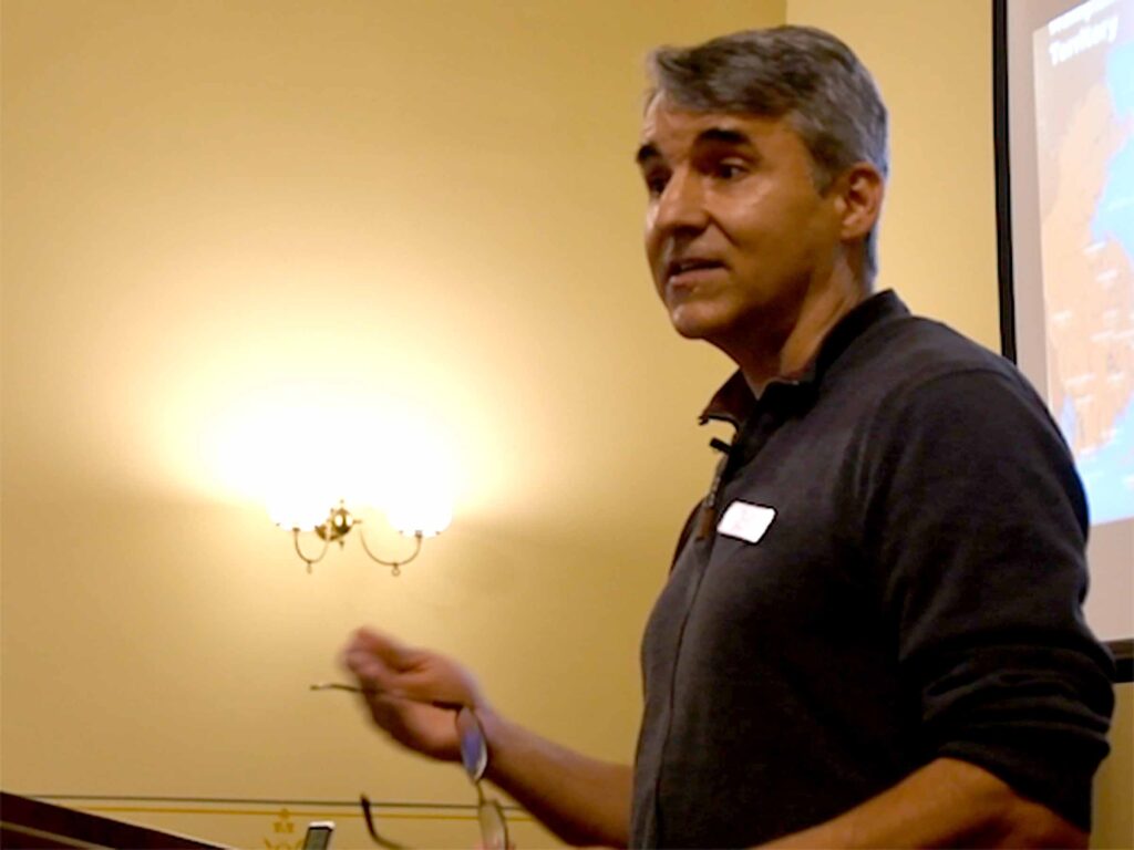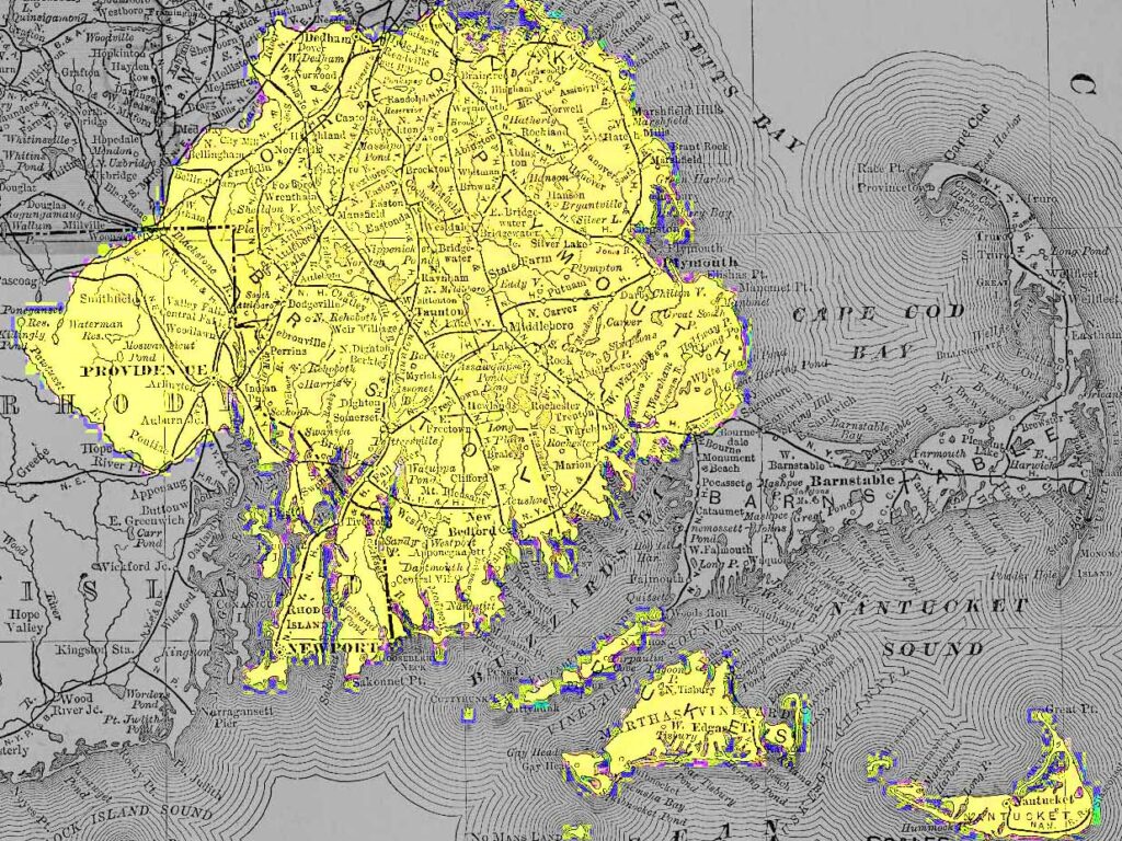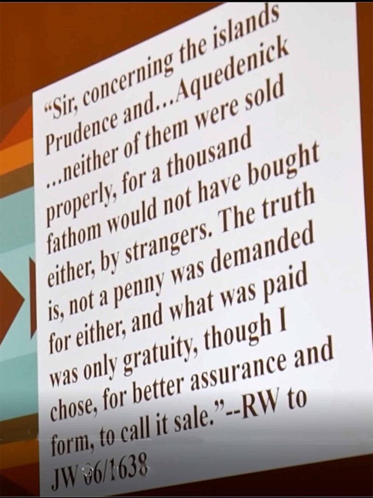(Above) Luce points out the 1675 Sellers map that shows Prudence, Jamestown and Aquidneck Islands as not part of “Pokanoket Country”, outlined in yellow. He goes on to describe how the Indigenous Pokanoket and Narragansett tribes attempted to accommodate the English settlers in Portsmouth but were soon severely limited by the laws and pronouncements that made it difficult for them to survive. King Philip’s War (1675-76) signaled the complete change from Indigenous to Colonial power in all of New England.