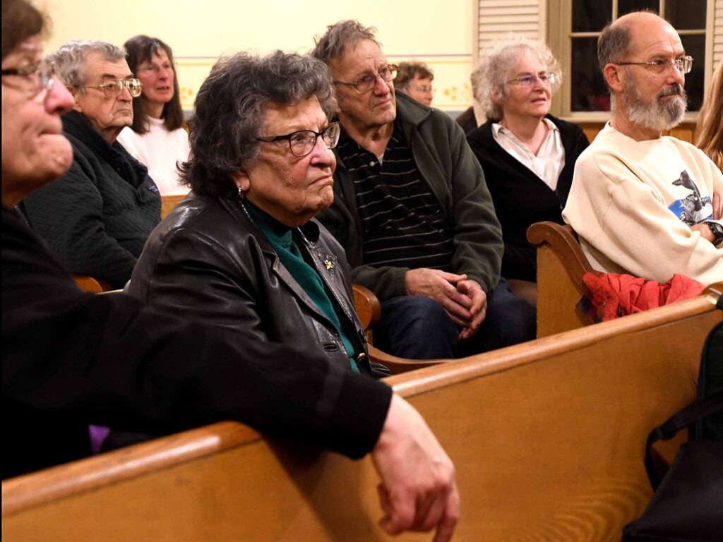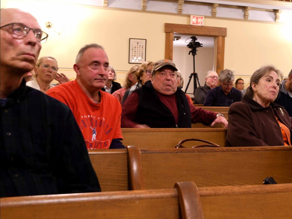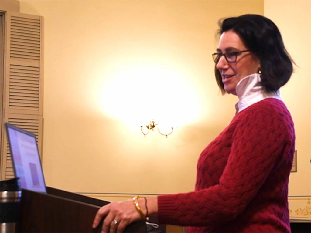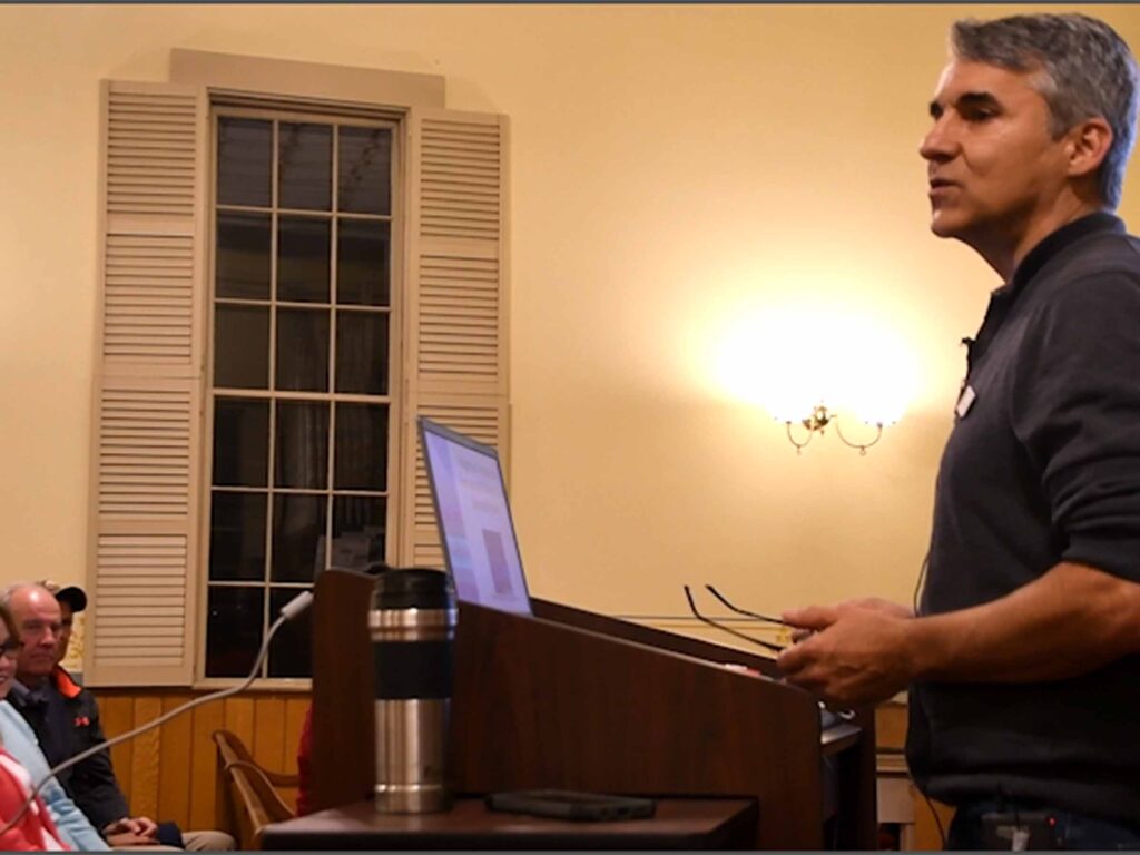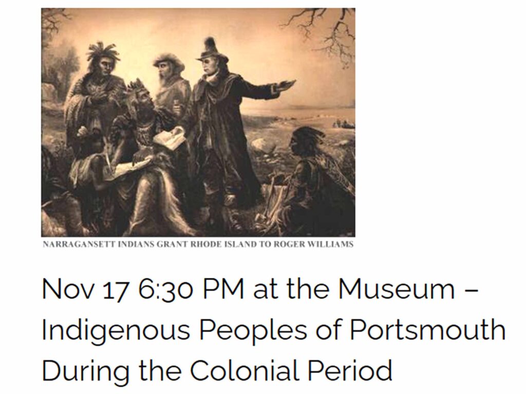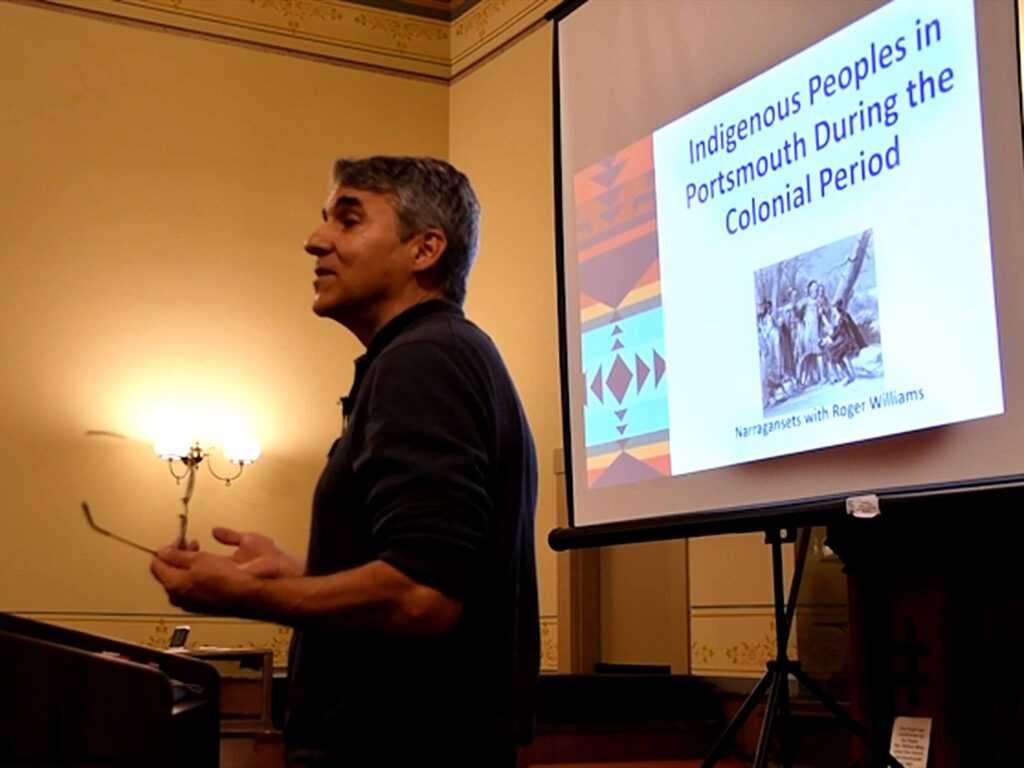 (Above) The audience listens as Portsmouth Historical Society President Anne Burns introduces Stephen Luce who presented on the “Indigenous Peoples in Portsmouth during the Colonial Period”. Click here for an 84-minute video of his November 17, 2022 presentation at the Historical Society Museum and here for a video of the talk posted on the Historical Society website.
