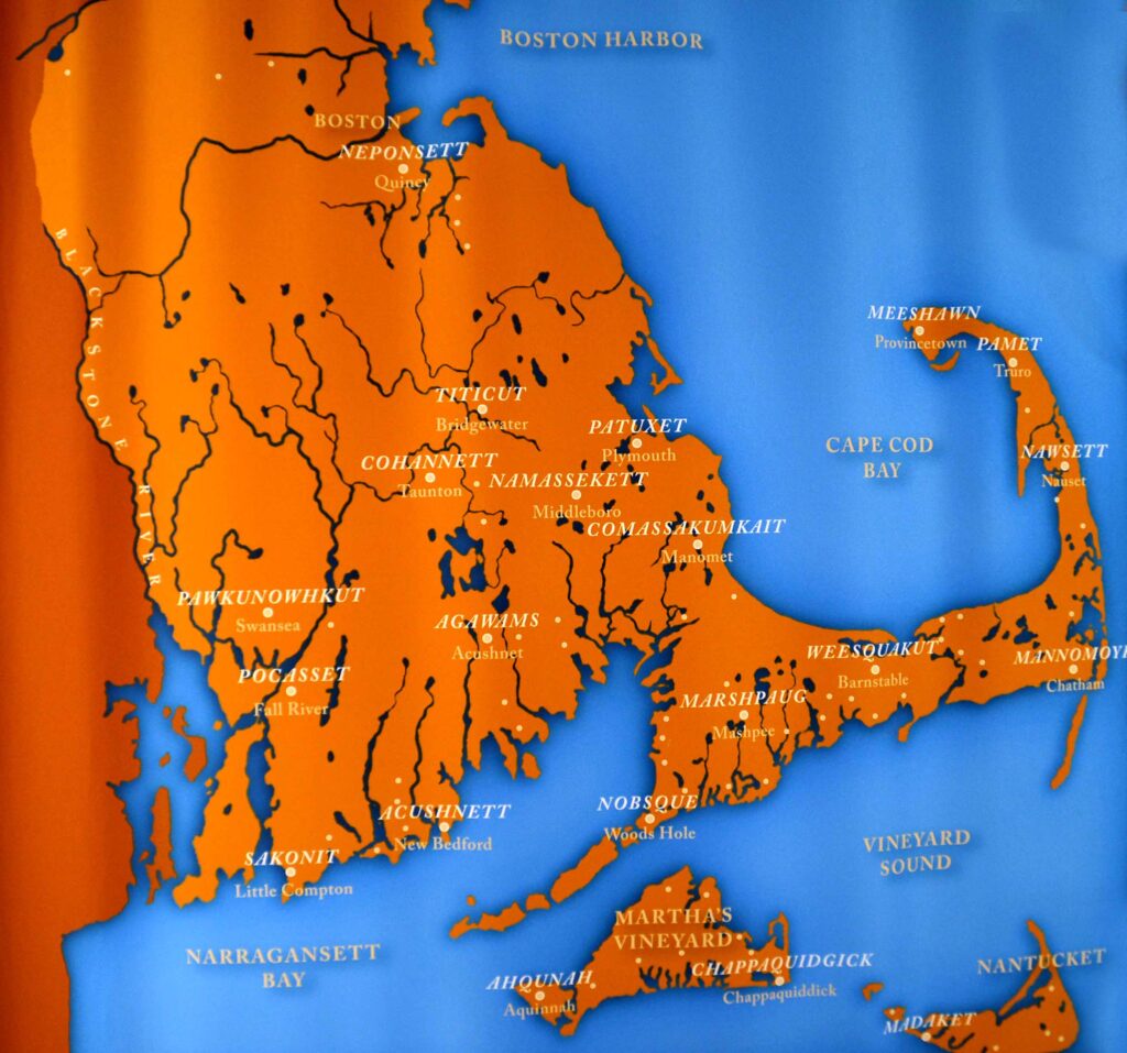 (Above) Luce describes two different maps of Wampanoag territories. Only the one in the center includes Prudence Island but not Cape Cod as part of their historic territory
