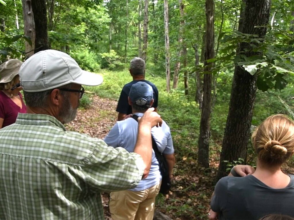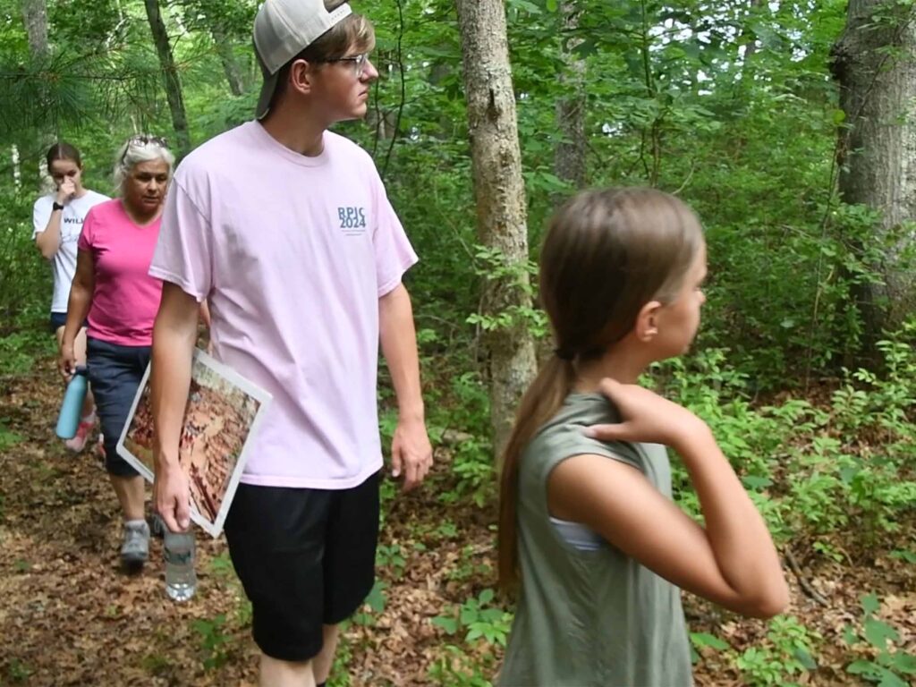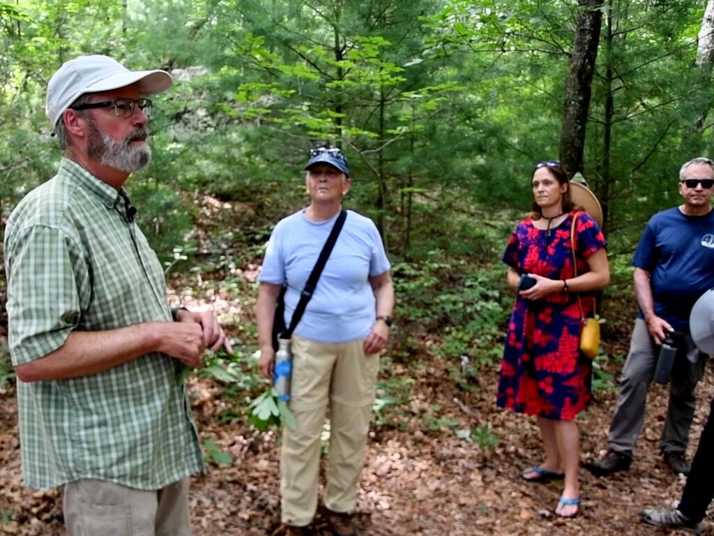 (Above) The group crosses a field in North Warren, RI, and walks through the woods in which the rock is located on private property. On the way, Morton talks about a possible Native burial ground in the area and some of the geology of the area in which the rock is situated.