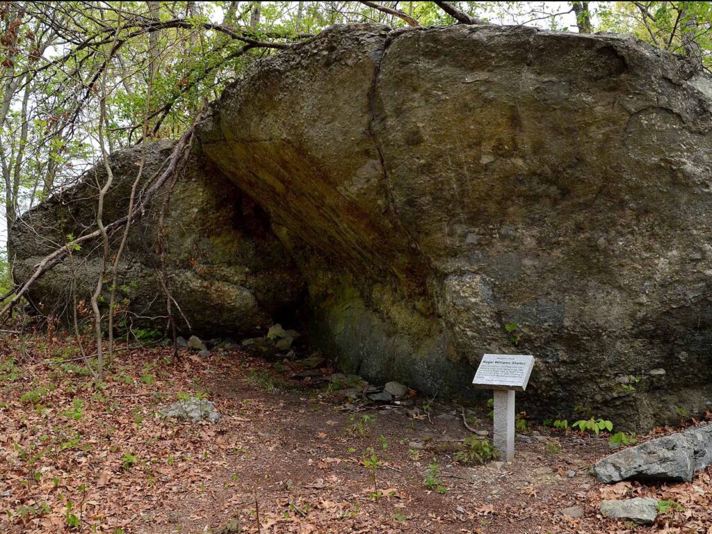 (Above) The group arrives and gets their first look at what is sometimes describec as a “cave” in that an indentation in the rock could have been used to build a shelter that the Pokanoket Massasoit Ousamequin may have offered to Williams whom he had befriended four years earlier when Williams lived in Plymouth.