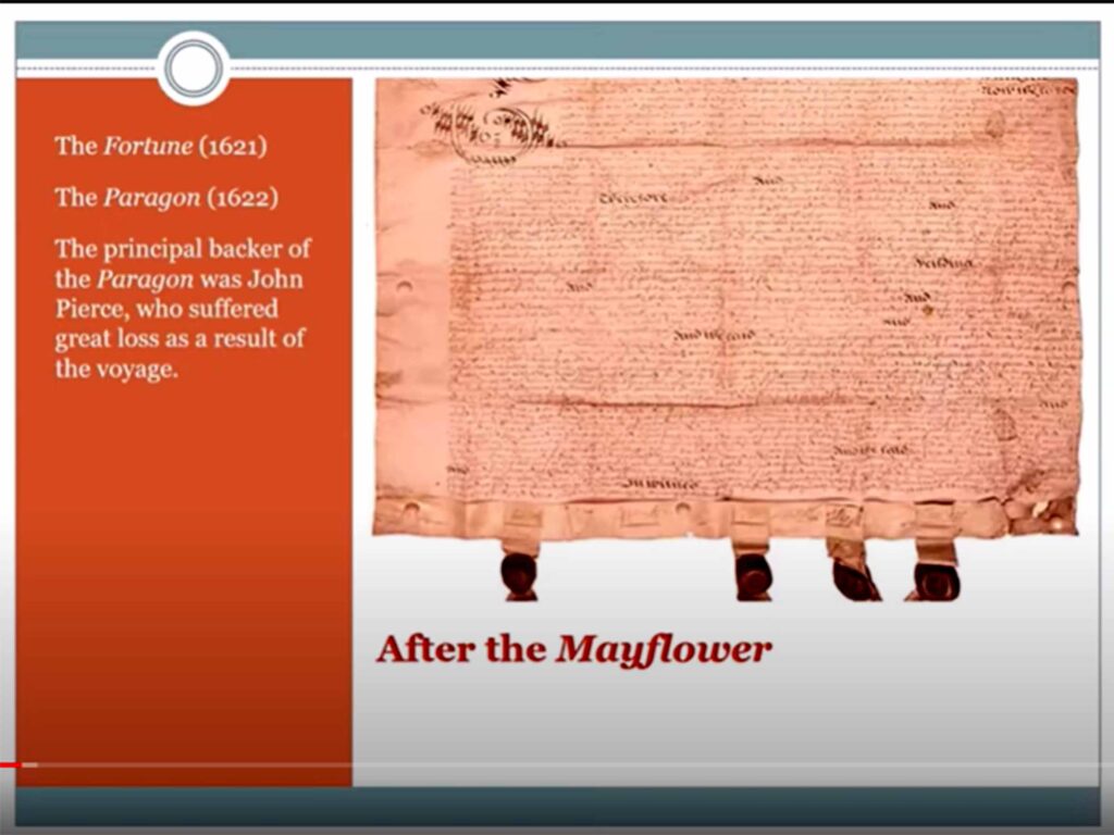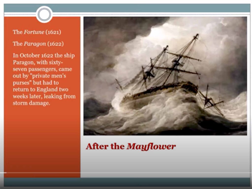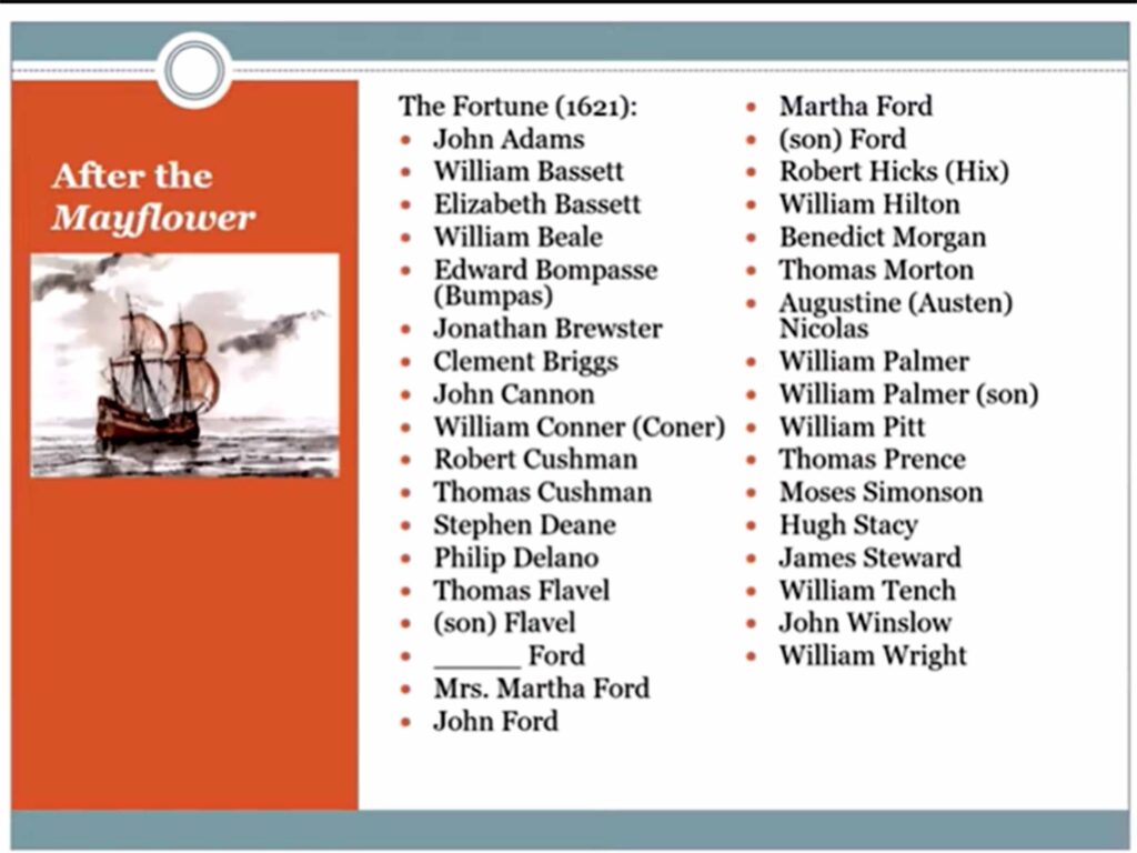 (Above) The Revd. Dr. W. Becket Soule is a scholar, professor, and priest, currently serving as the pastor of St. Margaret of Scotland Catholic Church in North Carolina. A descendant of several Pilgrim families, he is on the board of numerous Mayflower groups and is an editor for the Mayflower Silver Book series. He began his presentation with a list of the Fortune’s passengers and an illustration of the unsuccessful Paragon ship’s voyage in 1622.