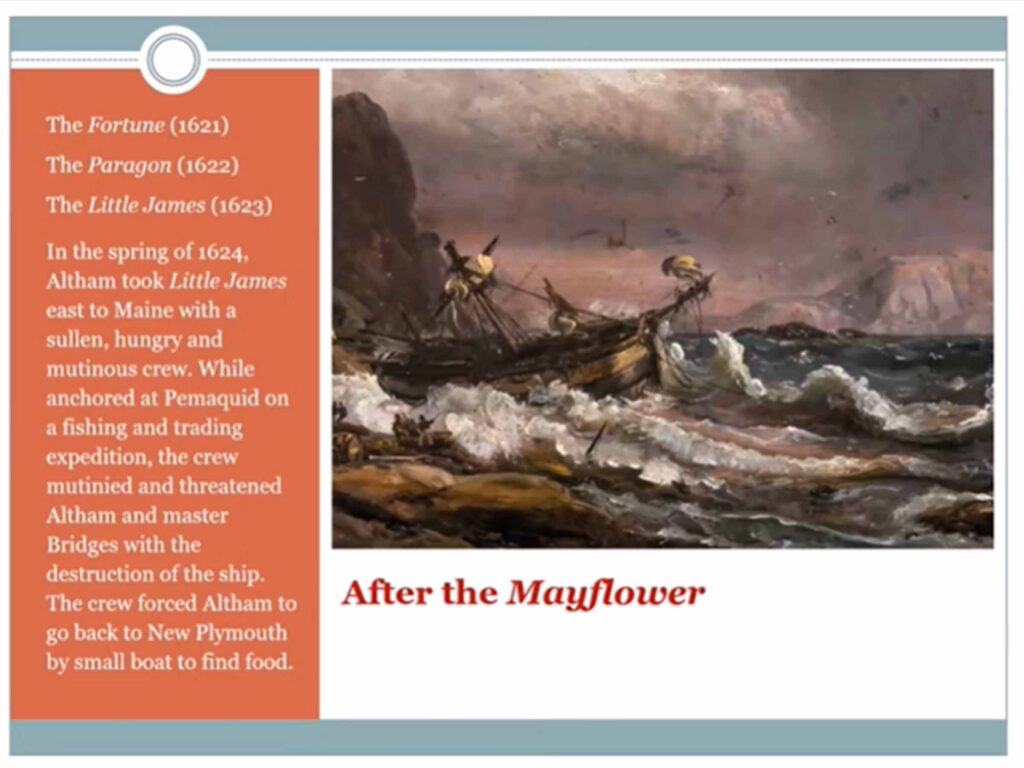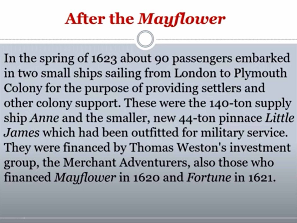 He then described the small ships, the Anne and the Little James, that made the voyage in 1623. The Little James broke up during a storm while anchored at Pemaquid, Maine