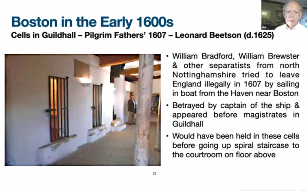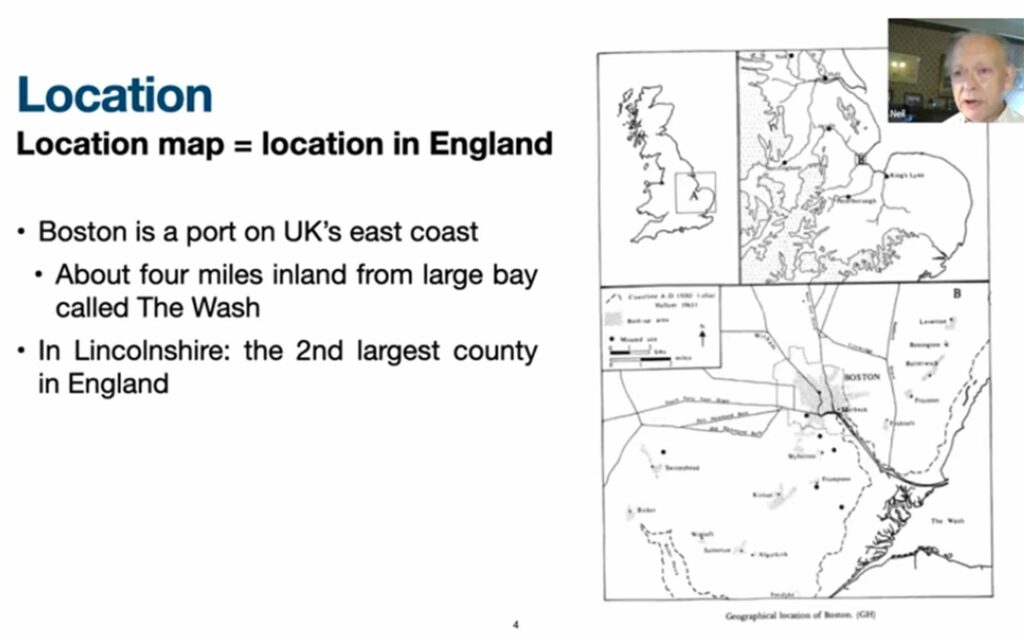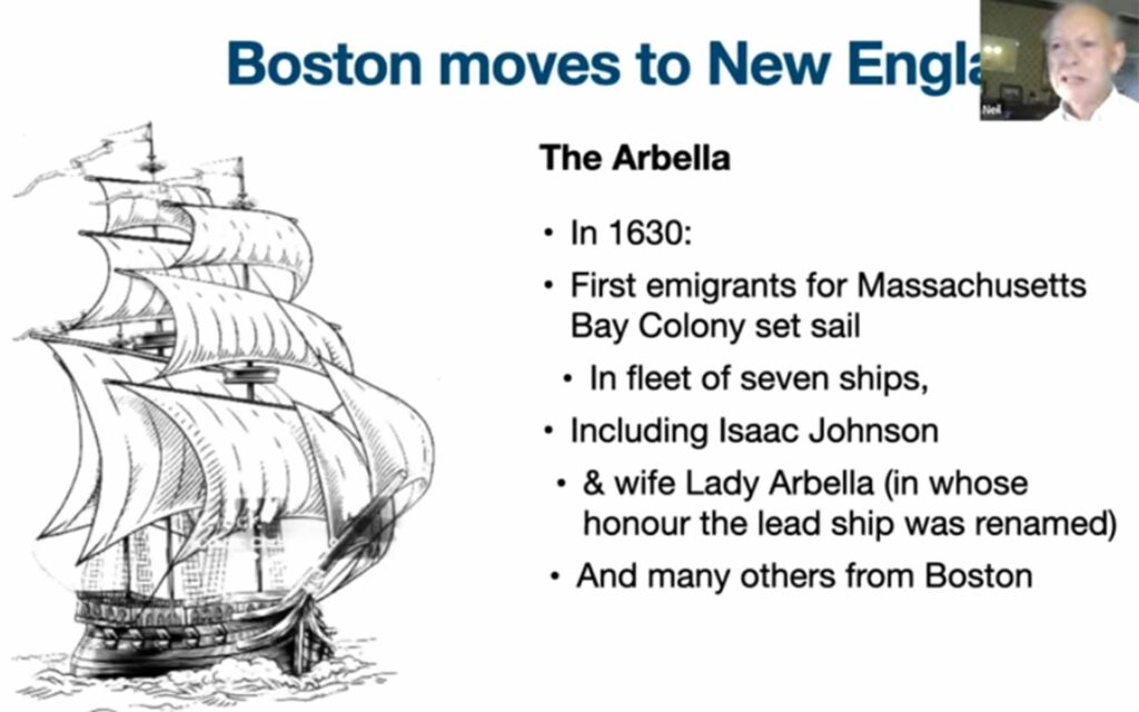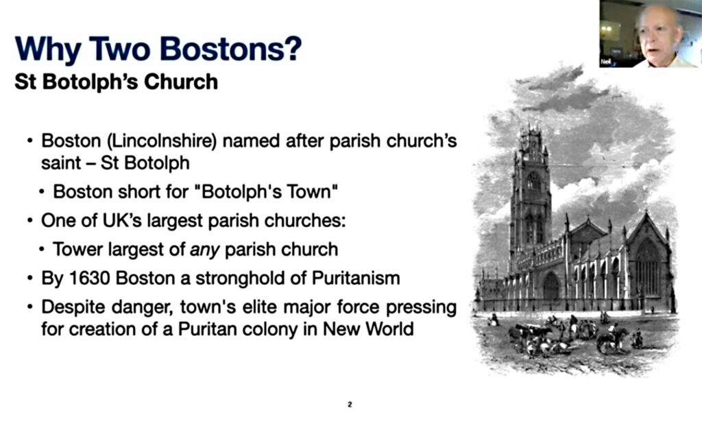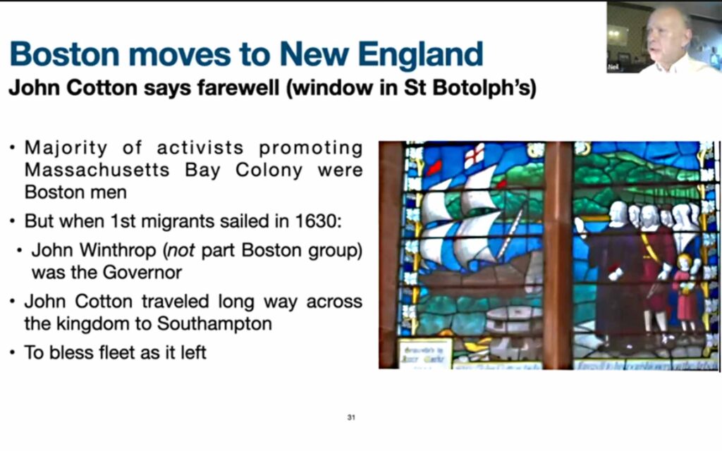 (Above) Wright concludes his presentation by talking about the migration of hundreds of its citizens to the American town of Boston starting with the Great Migration in 1630, including John Winthrop and John Cotton.