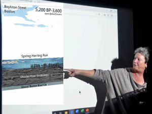 Ellen has been a practicing archaeologist for over 30 years, including work for the City of Boston and the Big Dig archaeological campaigns. She currently administers tow federal grants documenting and protecting critical island resources on three DCR managed islands. In the photo above right, she points to an animated gif of the fish weirs that were found 35 feet under Boylston Street in Boston during a subway tunneling project.