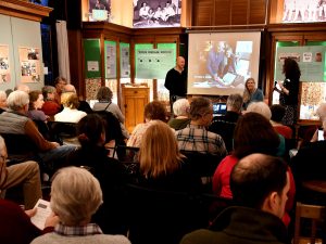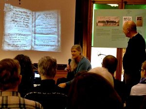 Historical Society Director Nickie Lefebvre introduces Joan and Neville who display a picture of a 1663 Bible from the Blickling Estate in Norfolk, England.
