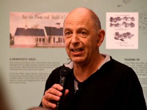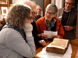 Audience members look at the Bible on disply and examine the Native language translation of the Scripture that were done by Native people under Eliot’s supervision.
