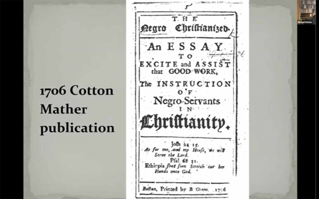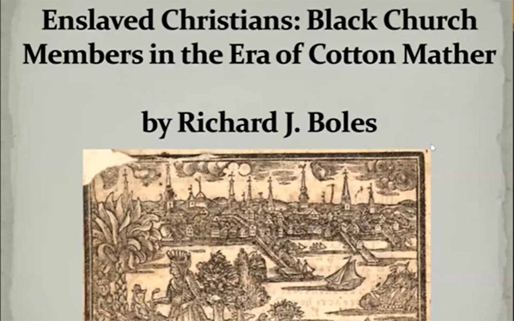 Historian Richard Boles‘ nuanced and trenchant exploration of the role of Puritan theology in New England slavery, and the way that enslaved people shaped the society around them, was the fourth in the 2023 fall Partnership of Historic Bostons lecture series, Enslavement & Resistance: New England 1620-1760. Mather’s and Edwards’s arguments for evangelization recognized that Black and Indigenous people were potential believers and could be spiritual equals. But these ministers also defended the legitimacy of slavery. Congregational ministers provided limited ways for enslaved people to affiliate with churches, and enslaved people across New England attended, joined, and sometimes influenced colonial churches. Click here for the 87-minute video of his on-line talk on November 30, 2023.