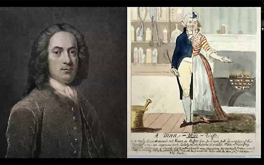 In 1788, the nonbinary and nonconforming Universal Quaker Friend, Jemima Wilkinson, dressed androgynously. There are pictures with Wilkinson dressed androgynous in male clerical robes but wearing petticoats underneath, sporting a man’s broad-brimmed, but wearing women’s shoes and hair cut short on the top with long curly black locks cascading across the shoulders. Dr. William Smellie (1697-1763) was known as the male midwife. He pioneered the use of obstetrical forcepips in delivery is said to have donned women’s clothing when attending birth so as not to alarm women in labor.