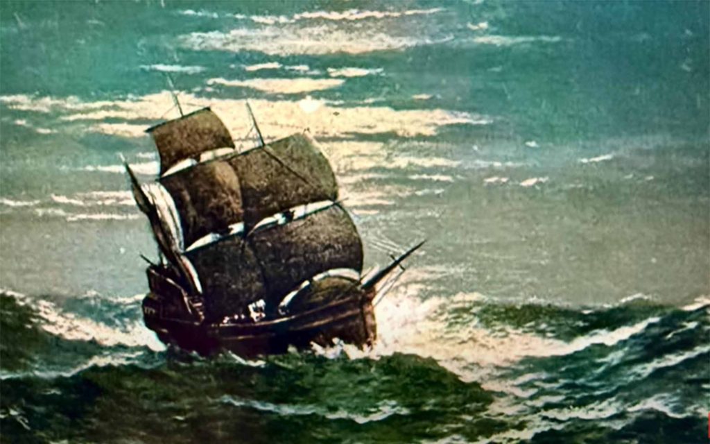 As the Mayflower (above, left) plowed westward through high seas in the fall of 1620 on its way to the New World, John Howland (above, right) was suddenly swept overboard. Fortunately he grabbed a topsail halyard that was trailing in the water and was hauled aboard with the aid of a boat hook. Jabez Howland, John and Elizabeth’s son, lived here with his family until they sold the house in 1680.