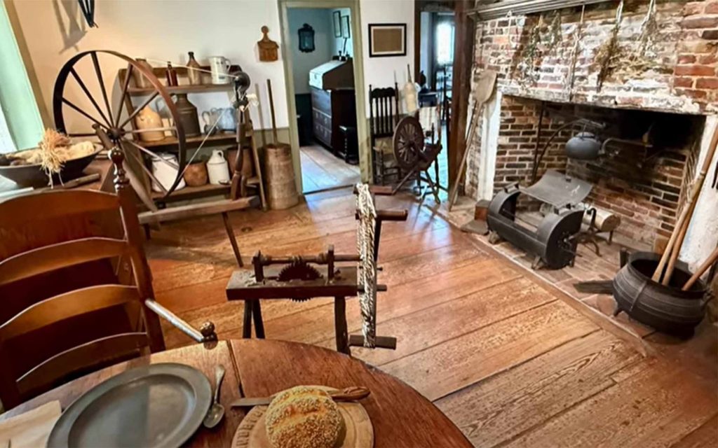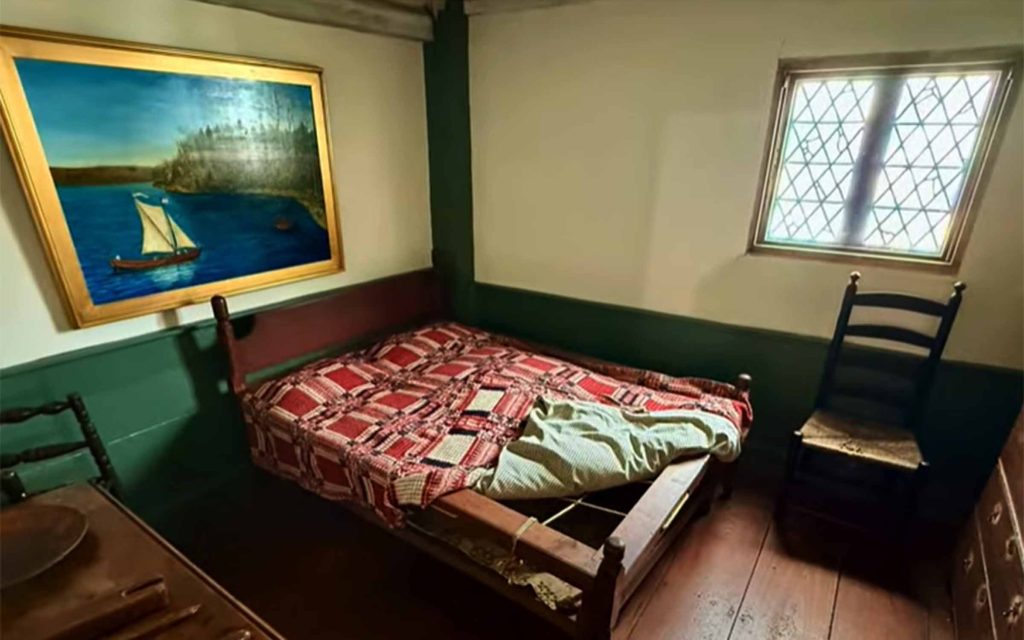 The Jabez Howland House is the only existing house in Plymouth where Pilgrims actually spent time. The original 17th century two-story timber framed house consists of a porch, hall and hall chamber. In the 1940’s extensive work was done to bring the house back to its original appearance. Today the museum houses fine period furniture and artifacts including items from archeological digs at the Rocky Nook home of John and Elizabeth and their son, Joseph. Click here for a 14-minute video tour of the house posted on May 18, 2025 by History Bites.