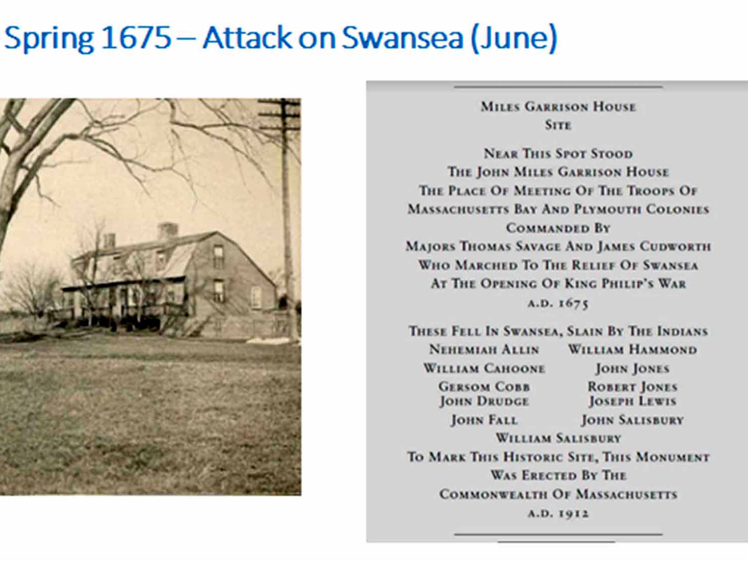 King Philip’s War began in 1675 as an Indian raid on several farms in Swansea, but quickly escalated into a full-scale war engulfing all of southern New England. Author Eric Schultz presented a summary of the conflict with a genealogical perspective to the Bristol Chapter of Massachusetts Society Of Genealogy on June 18, 2023. Click here for the 62-minute video of his presentation. Click here for an audio recording of the first 39 pages of that book that he and Michael Tougias published in 1999.