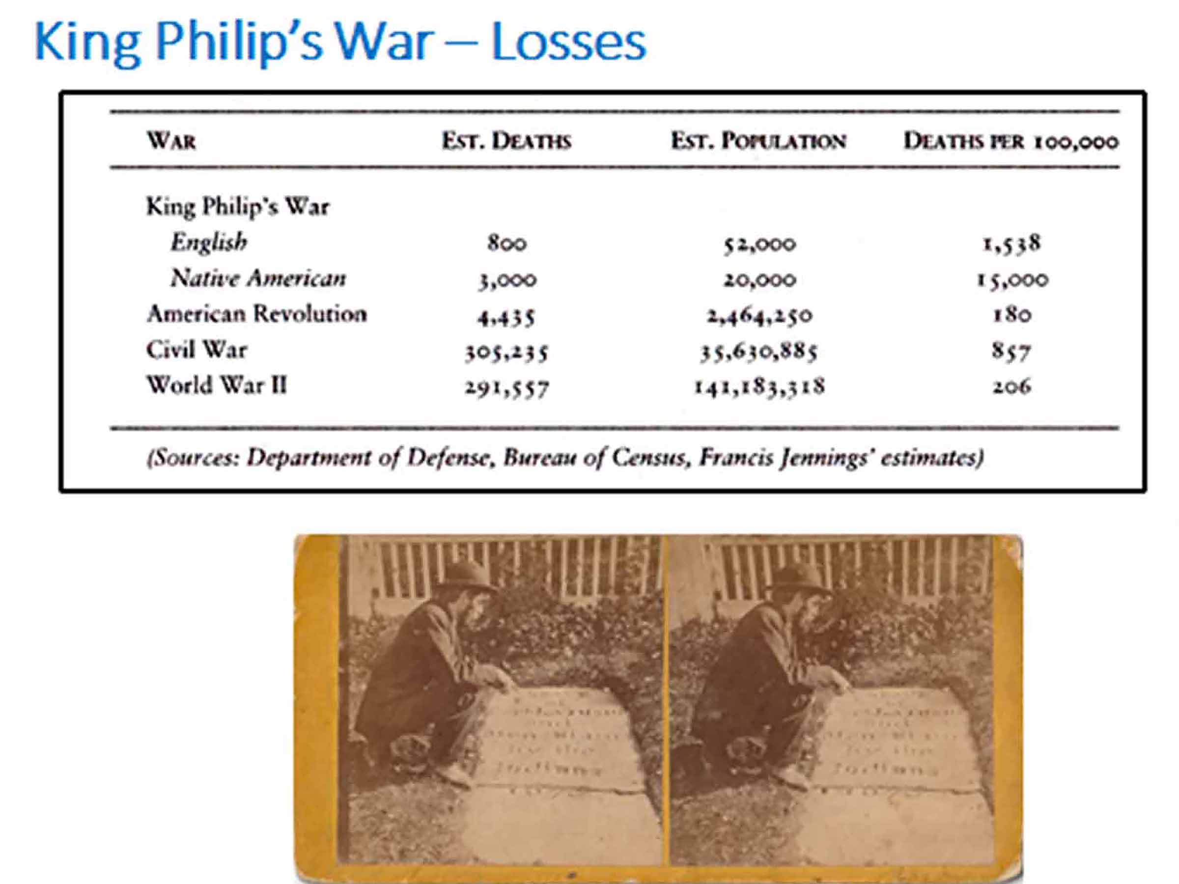 (Above) Schultz describes a hand print that was apparently left on a rock on Barden Hill in Middleborough by one of the Native warriors who was shot during the War. He then talks about the Great Swamp Massacre of December 1675 and the extraordinary number of casualties in the bloodiest war in North America.