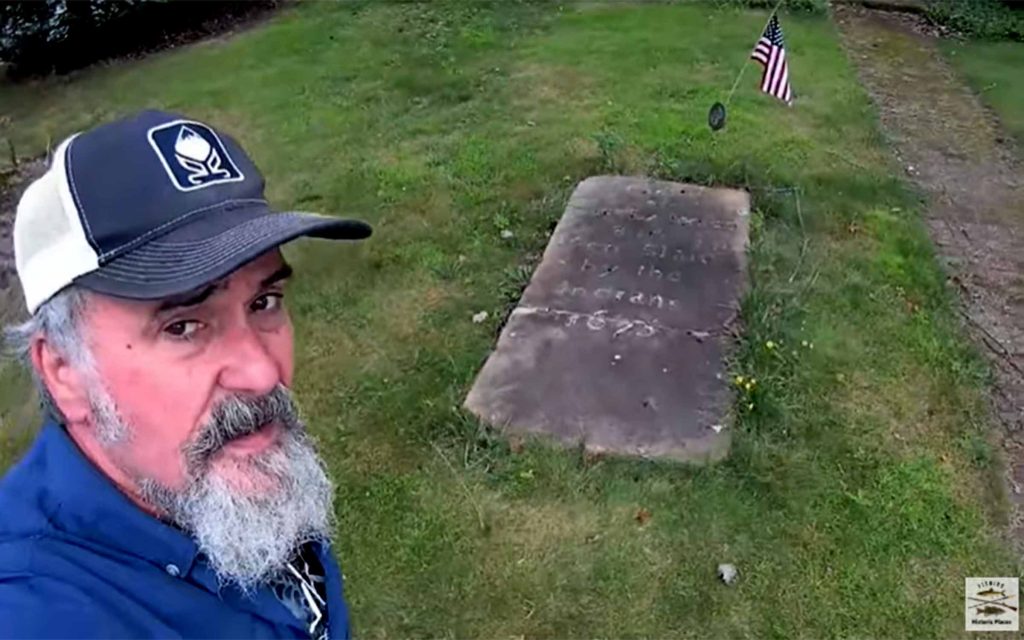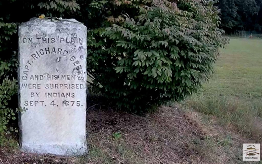 In the Battle of Bloody Brook, the English troops were distracted by the wild grapes that were ripening along the stream when hundreds of Native warriors led by Muttawmp descended on them. (Above, right) Svec stands beside the stone that marks the mass grave were dozens of English soldiers were buried.