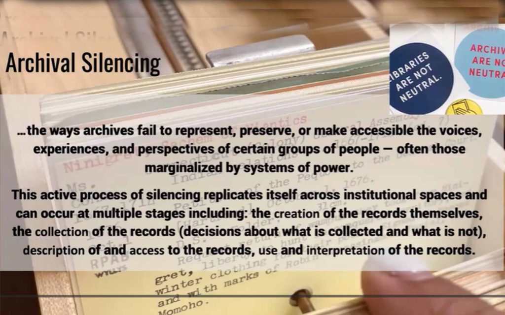 Tony states, “when I speak about archival silencing, I mean both what is left out and what was included in the ways in ways that distort and diminish indigenous presence. The acknowledgement of the non-neutrality of archives is a call for everyone to work to recognize different modes of deception.”