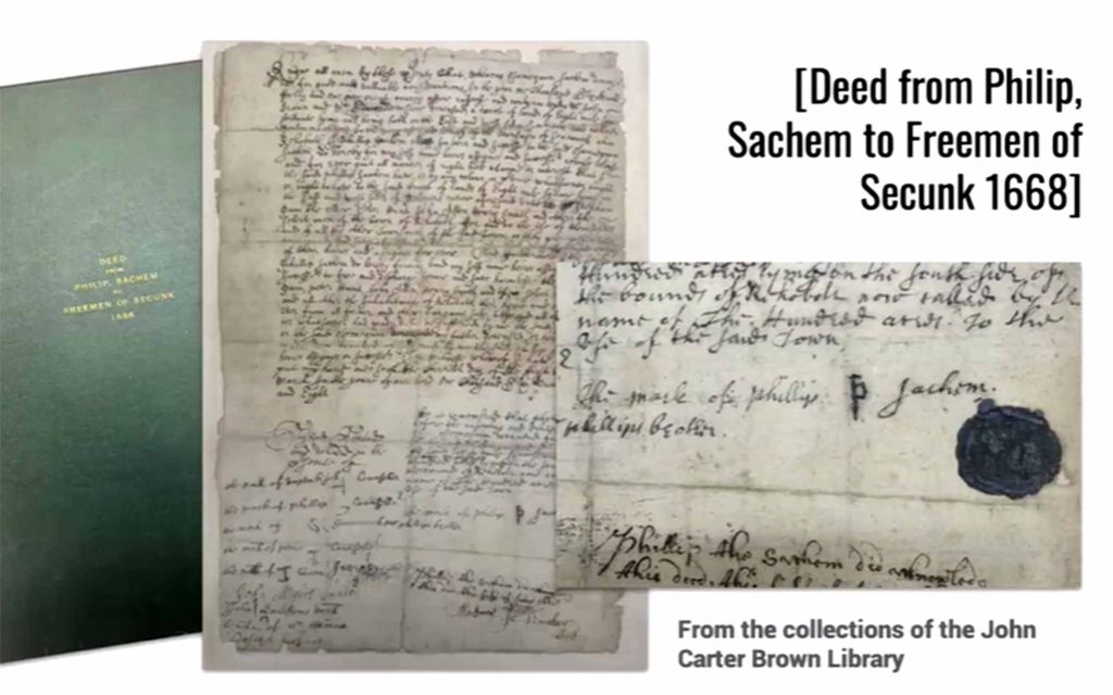 King Philip’s War officially ran from 1675 to 1676, but its violence and consequences continued decades longer. Its legacies are still very much with us today. The documents shown above and below, like libraries and archives themselves, are not neutral. They’re products of colonial systems of knowledge, law, and authority, and they continue to shape how we understand the past and how land is held into the present.