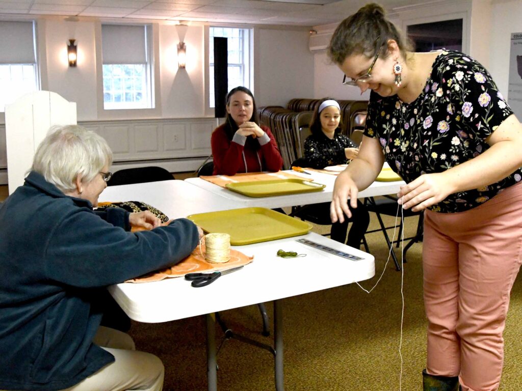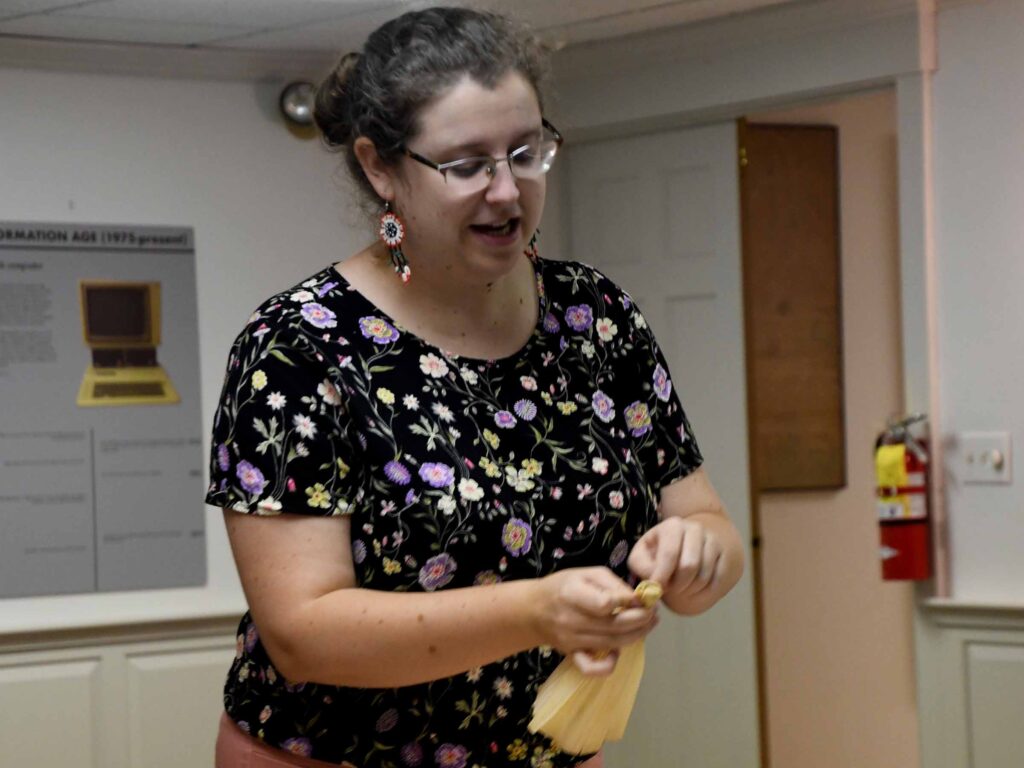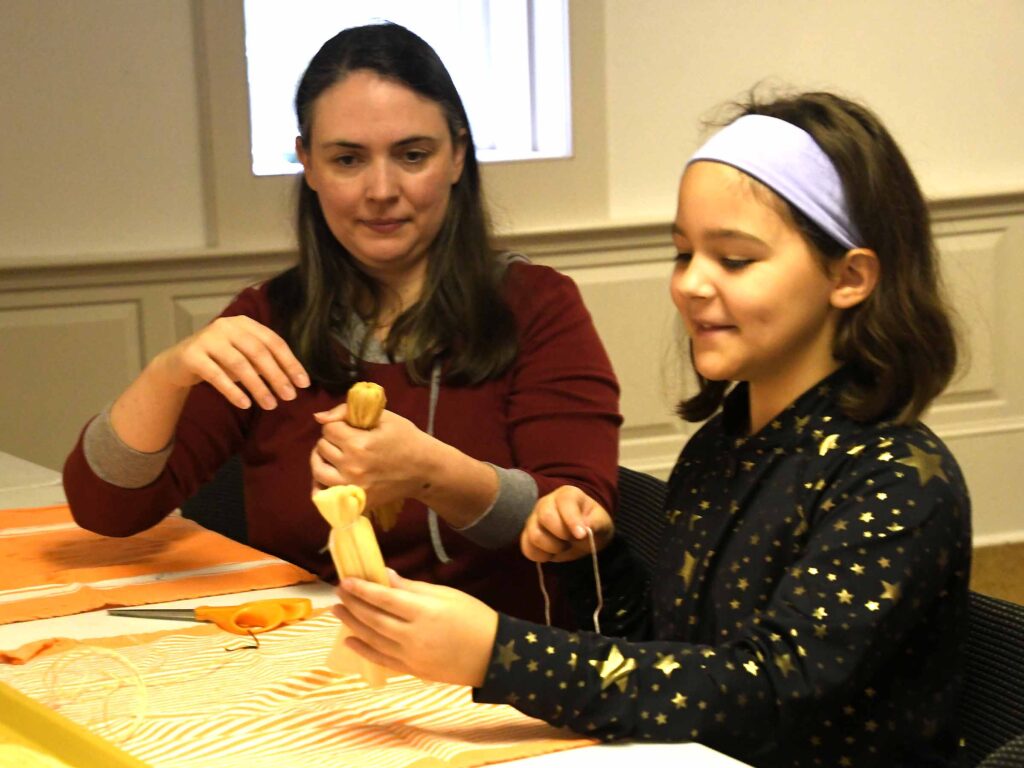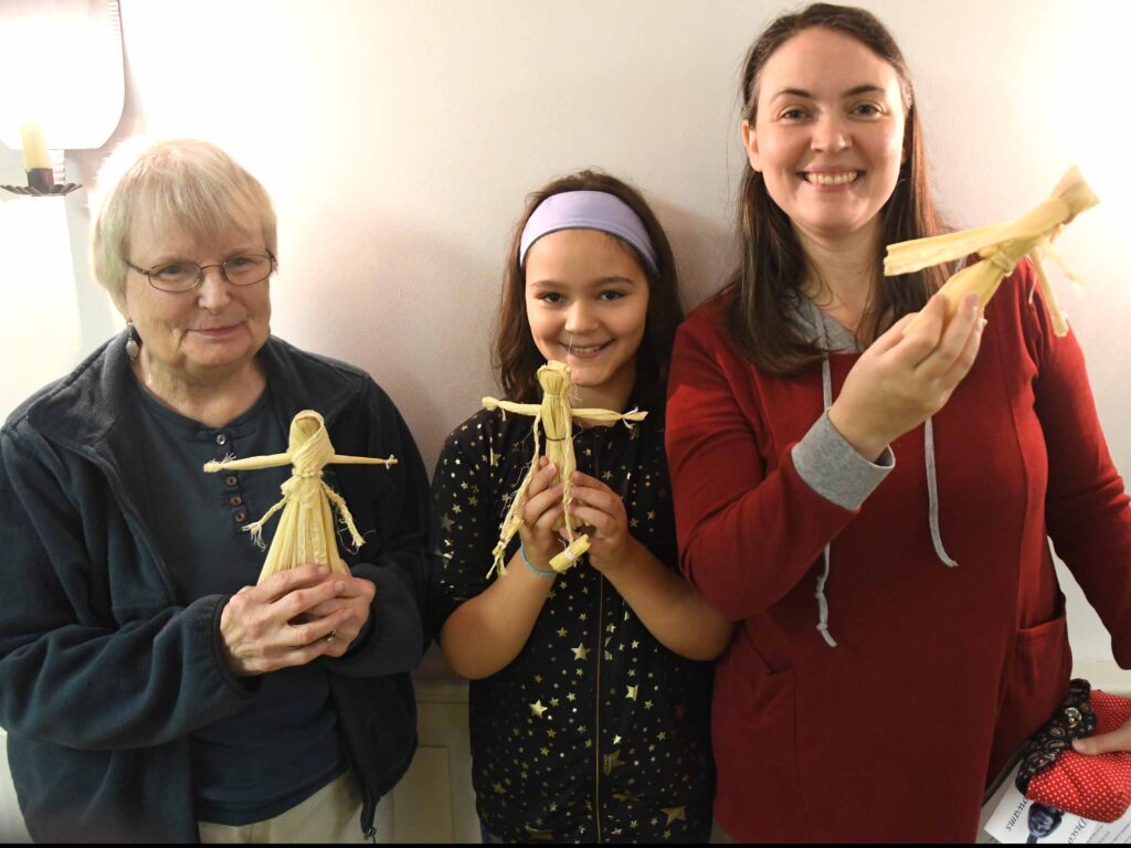 (Above) Carpenter Museum Interim Director Chelsea Johnston works with Abby McWain, her daughter and Paula Fazio to show them how to make corn husk dolls.
