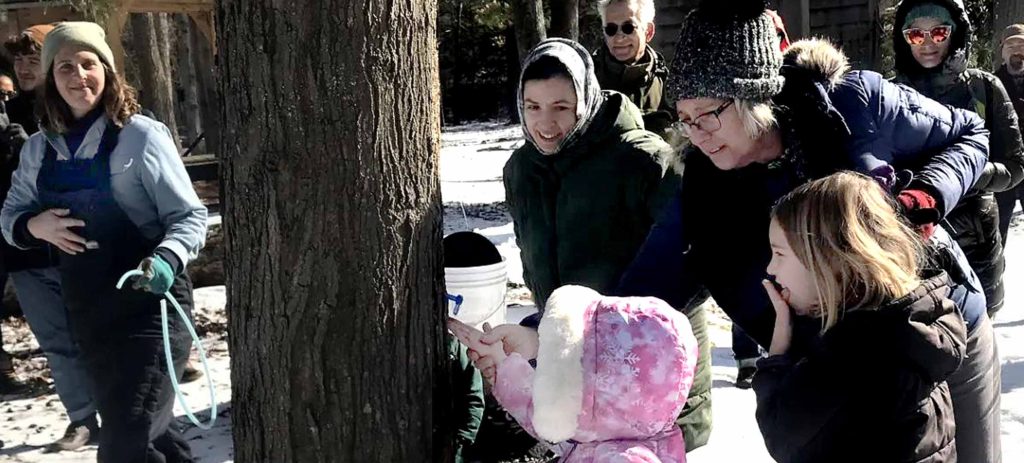 Osamequin Farm Director Sarah Turkus (left) smiles as children taste the sugar in the sap as it comes out of a tree.