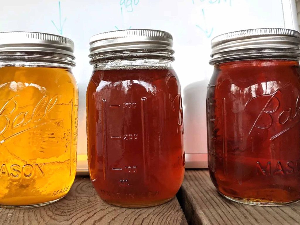 (Above, left) People listen to the program while the collected sap is boiled down to make syrup. The jar on the left holds syrup made from the earliest taps, the one in the middle from two weeks ago, and the one on the right from sap boiled earlier in the day of the demonstration. 160 gallons of sap was boiled down to make three gallons of syrup.