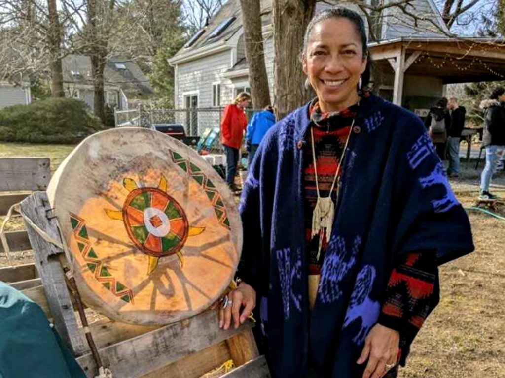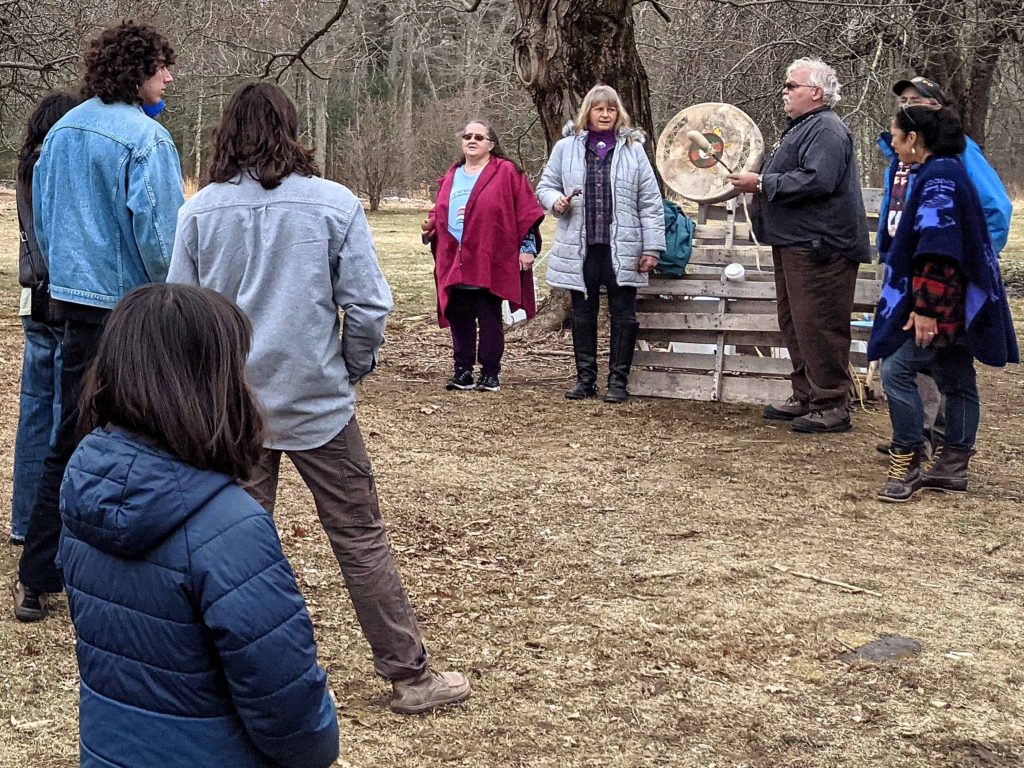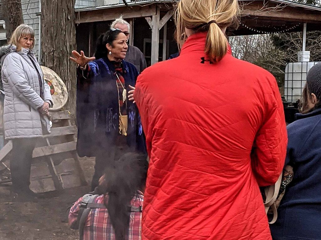 Pokanoket Sachem Dancing Star (above, left and center) told a story about the maple moon and gave a little bit of maple sugaring history from an Indigenous viewpoint. She also offered a land acknowledgement and sang a song with Blue Star, Rainbow Heart and Listening Wind as Snowy Owl drummed.