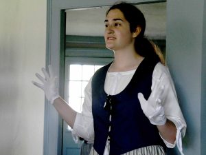 Docent Haley Correia welcomes members of the 17th Century Rhode Island MeetUp group to the house.