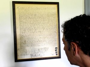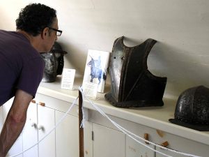 MeetUp Group organizer and Providence College professor Doug Blum examines some of the armor used at the time as well as a copy of the original deed to the house.