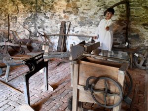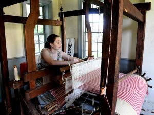 Docent Ashley Reynolds demonstrates the use of a loom similar to those used at the time while Kathrnye Soper describes some of the furnishing in the parlor.