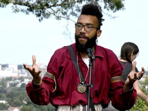 Raymond “Two Hawks” Watson spoke at the event, saying “So Miantanomi came up here with Roger Williams and it is said that he stood here at this very spot, reached out with two arms, and said to Roger Williams ‘You can use the land between here,’ and if you look behind us, of course, right down the middle you will see what the lovely, lovely skyline of what is now Providence.”