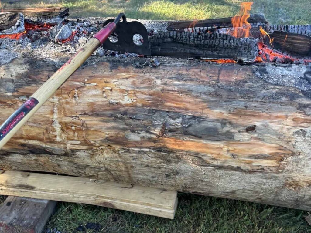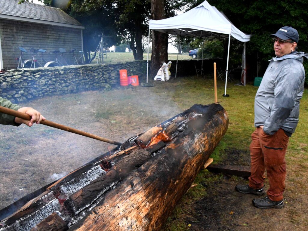 (Above) The large pine log arrives from Gurney’s Saw Mill in East Freetown at the Historical Society where the process begins with burning logs placed on top.