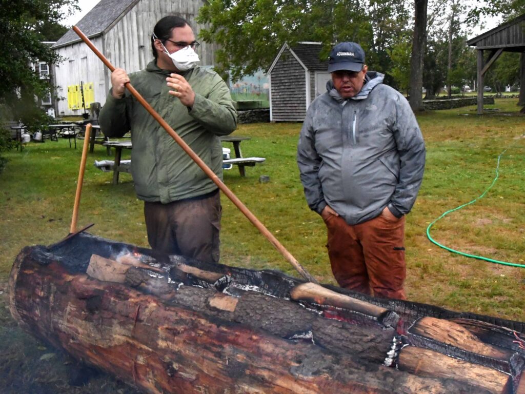 (Above) Andrew Devido and Jonathan Perry work on burning the mashoon at the Historical Society. The mishoon and the ceremonies surrounding it are important parts of two Historical Society projects: this year’s transportation exhibit, Little Compton Connected, and next year’s Sakonnet History Project. [Photos above and below courtesy of the LC Historical Society]