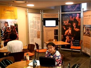 The exhibit was set up on the lower floor of the Stephen Roberts ’62 Campus Center at 75 Waterman Street on the Brown University campus in Providence, RI. One three-minute video in the interactive exhibit tells the story of the Mayflower from the Native perspective.