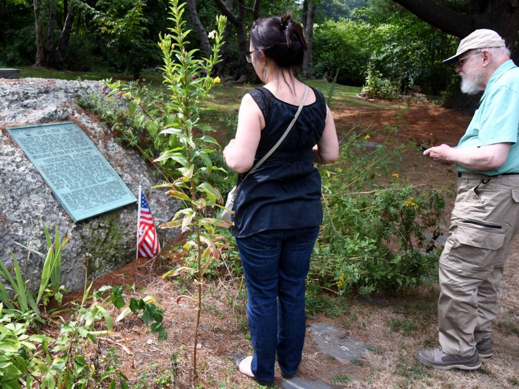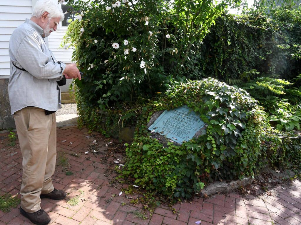 (Above left and center) John Morrison prepares to photograph the marker at the Massasoit Spring in Warren, after he and Sarah Stewart read the marker at Mt. Hope Farm. (Above right) Sarah and Fred Meyer read the tablet about Ann Hutchinson at the Founders’ Brook site in nearby Portsmouth, RI.