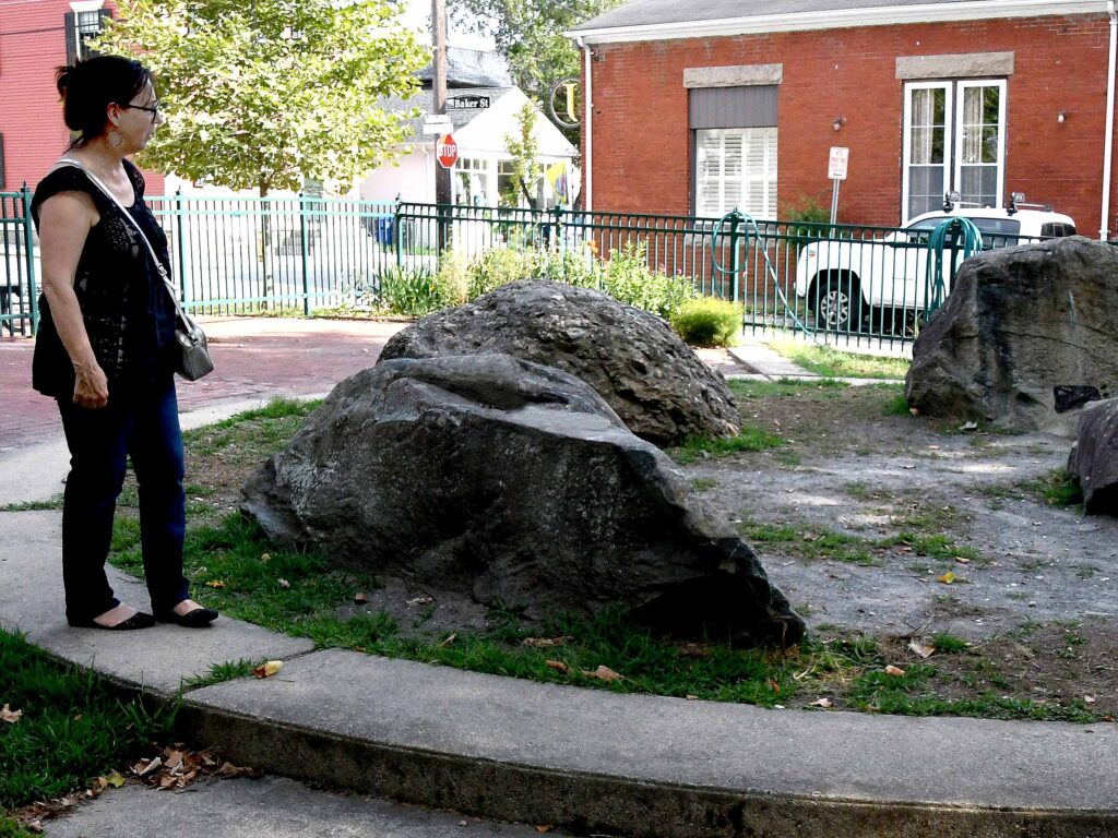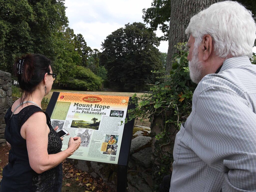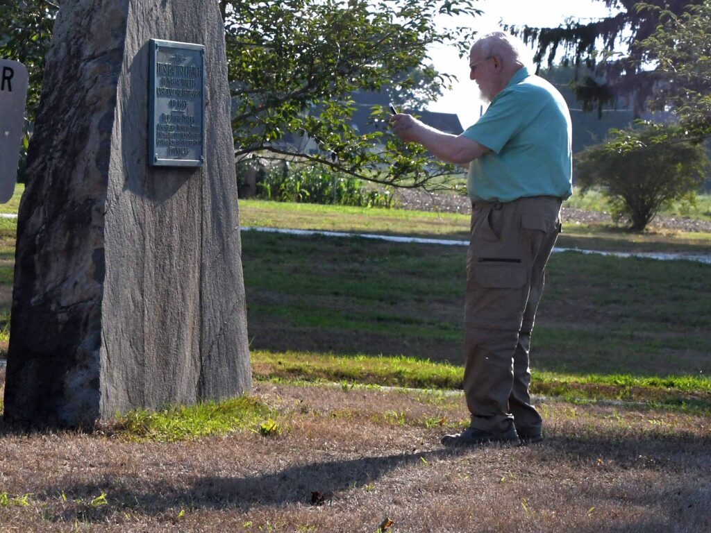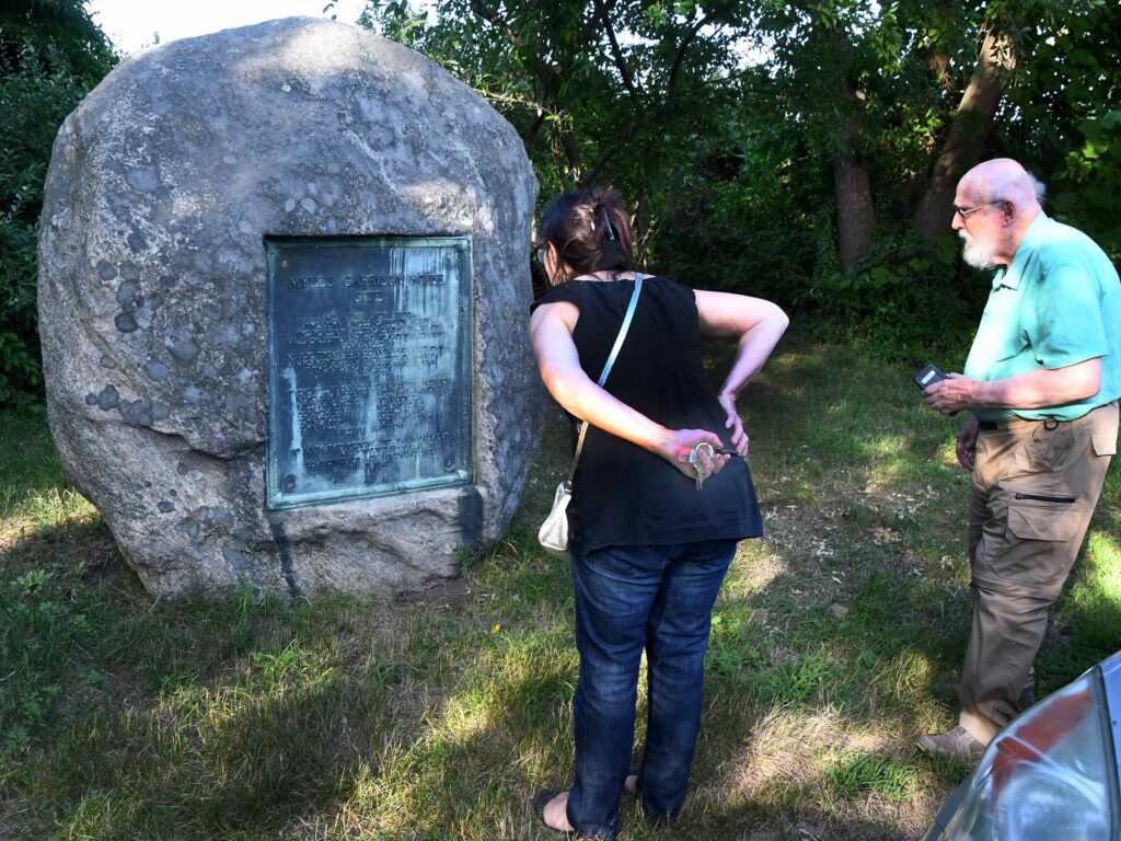 (Above left) Sarah looks over the stones at Massasoit Park in Warren that are decorated with Native symbols. (Above center and right) Sarah and Fred look at the marker for the Myles Garrison and the first Baptist Church at Nockum Hill in Barrington.