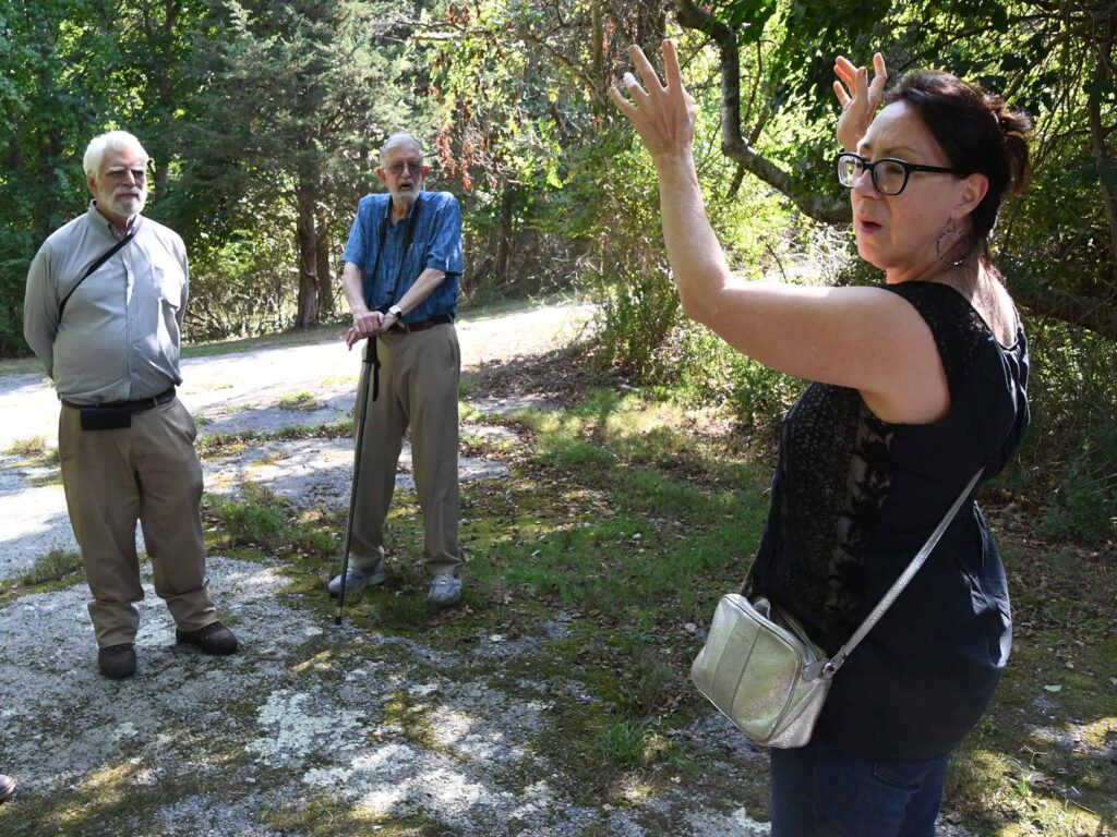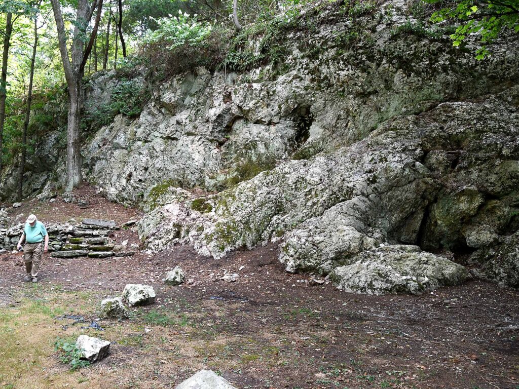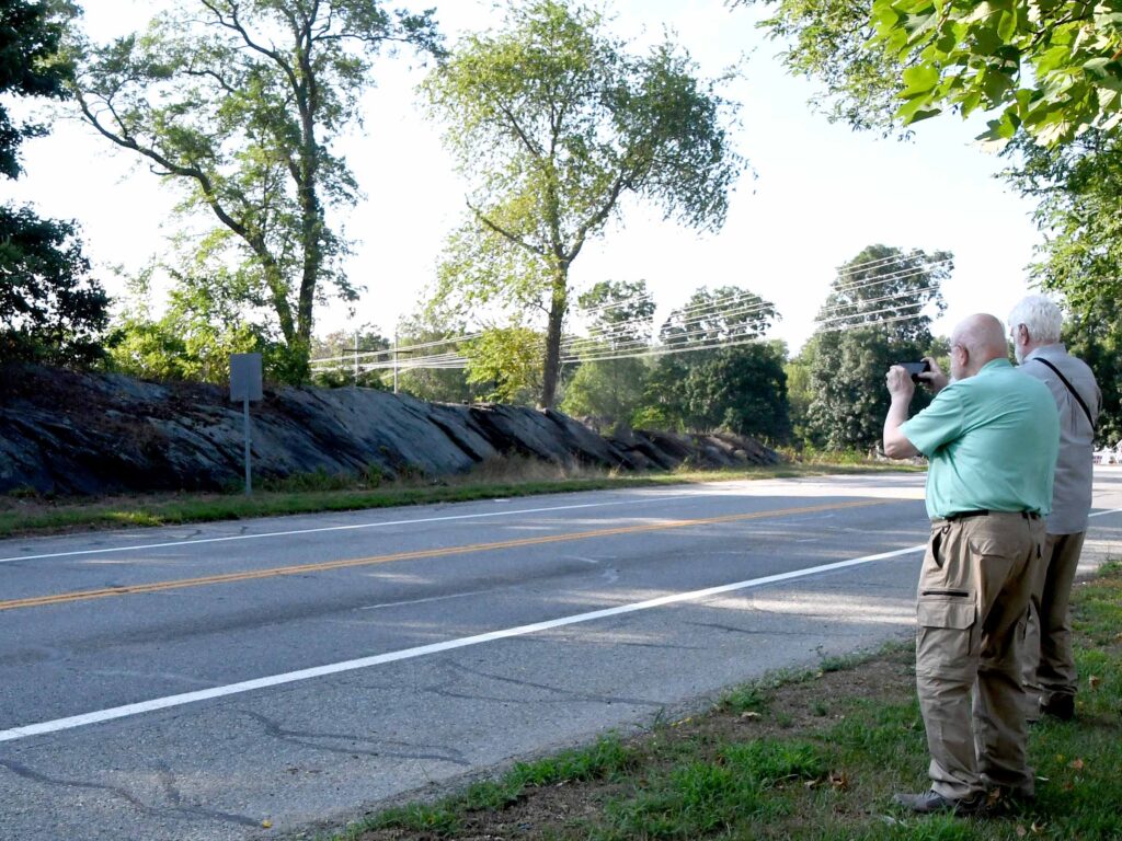 (Above) Fred walks near the Seat of Metacom at Mt. Hope as Sarah talks to John and Will about the spiritual significance that the site must have had for the Pokanoket Tribe. (Above right) Fred and John photograph Kings Rock, once called the “National Grinding Stone” at Sachem’s Knoll on the Warren-Swansea border located not far from Margaret’s Cave.