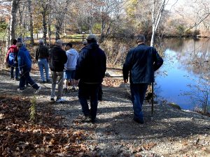 Starting at Village Park behind the Swansea Town Hall and Library, Paul led a group of 27 to Abram’s Rock, a large conglomerate stone outcropping in the woods.