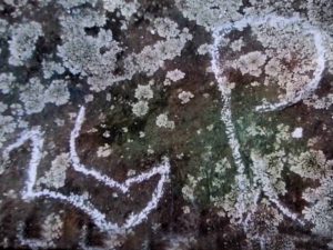 Paul Cote told the story that Orrin Gardner wrote “The most familiar legend handed on to us about Abram’s Rock is that he was a poor Indian who had deserted his tribe, coming to this settlement where he made his living in peace. But King Philip of the Pokanokets decided to take Abram back, fearing his friendship for the white man. Abram found this towering rock as a hiding place. On the west side is a room formed by boulders. It is still called ‘Abram’s Bedroom’ — after 300 years. He is said to have lived there for several months, til tracked down and captured. He was given a chance for his life. The sentence was death or three leaps from the top of the rock to the ground below. Abram took the chance, and tradition says that his first and second leaps from the towering rock were safely made, but the third jump killed him.” Two inscriptions on the rock are outlined on the right.