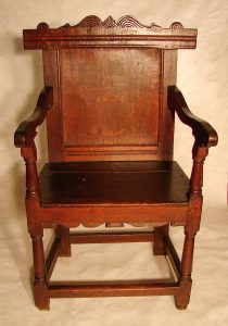 (Above) The historic Winslow House, from c. 1699 and located in Marshfield, Mass., was built by Penelope’s son, Isaac, who lived there with his wife, Sarah, six children and servants and slaves in the early 1700s. At the right is a photo of a Wainscot Joined chair from 1630 which was a Winslow family possession. [Courtesy Pilgrim Hall Museum]