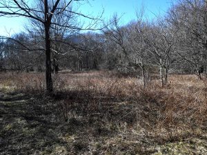 The property is rich with old stone walls, vernal pools, and old towering oaks and maples. The blue blazed trail runs from Metacom Avenue westerly to the power line easement and the yellow loop trail. The yellow trail loops through the midsection of the property passing areas of birch trees, a cedar grove, and small outcrops of pudding-stone.