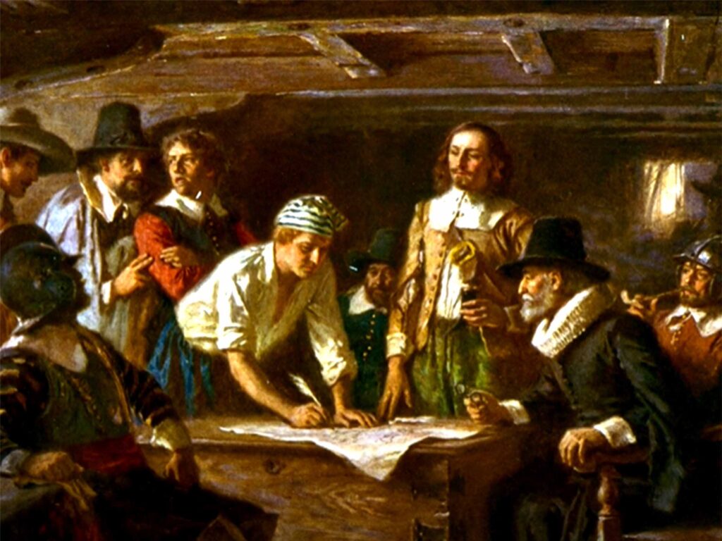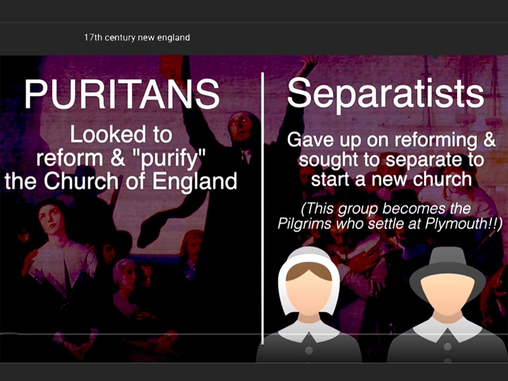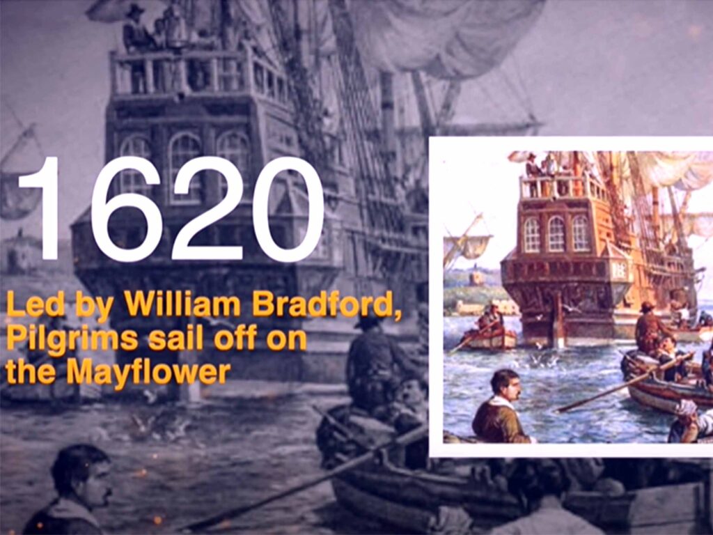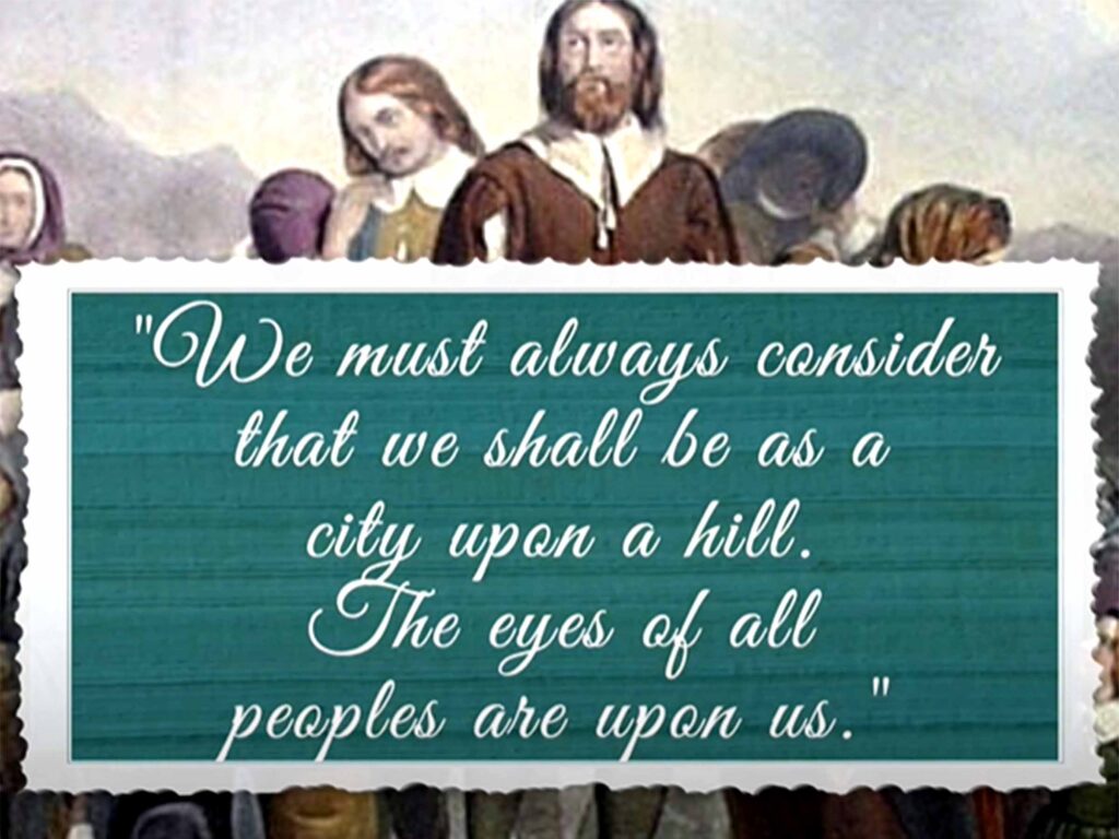 The video covers the Mayflower Compact (above, left), the alliance with the Wampanoags, John Winthrop’s City Upon a Hill sermon (above, right) and the formation of the Massachusetts Bay Colony by thousands of Puritans.