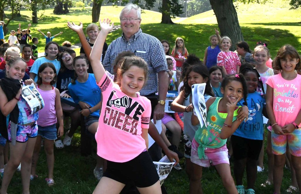 A group of about 50 younger children and about 40 older campers and staff gather around a picnic table near the marker to listen to Dr. Weed. A Pokanoket Heritage Day program was planned to take place in the Park two days after his presentation.
