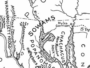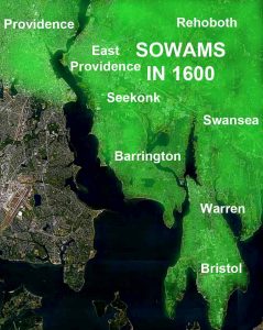 Sowams, the area in East Bay Rhode Island and nearby Massachusetts [click on maps to enlarge], was the main settlement of the Pokanoket when the Pilgrims arrived. Bradford had been told that the land of the Pokanoket had “the richest soil, and much open ground fit for English grain, etc.”, giving hint of the conflicts over land that would soon develop. [Wikipedia]  Pokanoket believe that their territory is an element of the American Aborigine heritage that is their birthright, and that they are the stewards even of land which they do not legally own.
