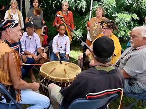 (Above) Modern day Pokanoket tribal members drum at a Pokanoket Heritage Day event in Warren, RI, and current Sagamore Bill Guy, the tenth generation descendant of Massasoit, speaks at the King Philip Seat in Bristol, RI.